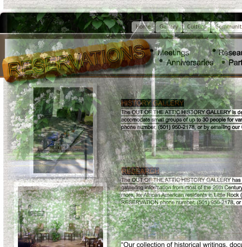 The OUT OF THE ATTIC HISTORY GALLERY has reference information that will assist in gathering information from most of the 20th Century pertaining to education, culture, heritage, plus more, for African American residents in Little Rock (Pulaski County), Arkansas by calling our RESERVATION phone number, (501) 950-2178, or by emailing our Curator/Owner at:
